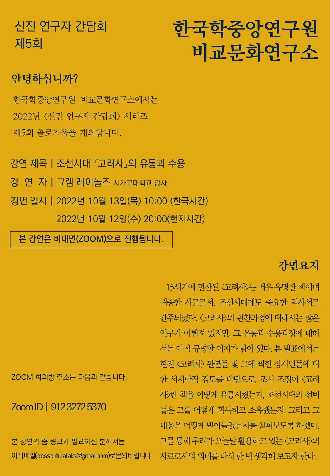 한국학중앙연구원 비교문화연구소 2022년 <신진연구자간담회> 시리즈 5회 콜로키움 개최 안내