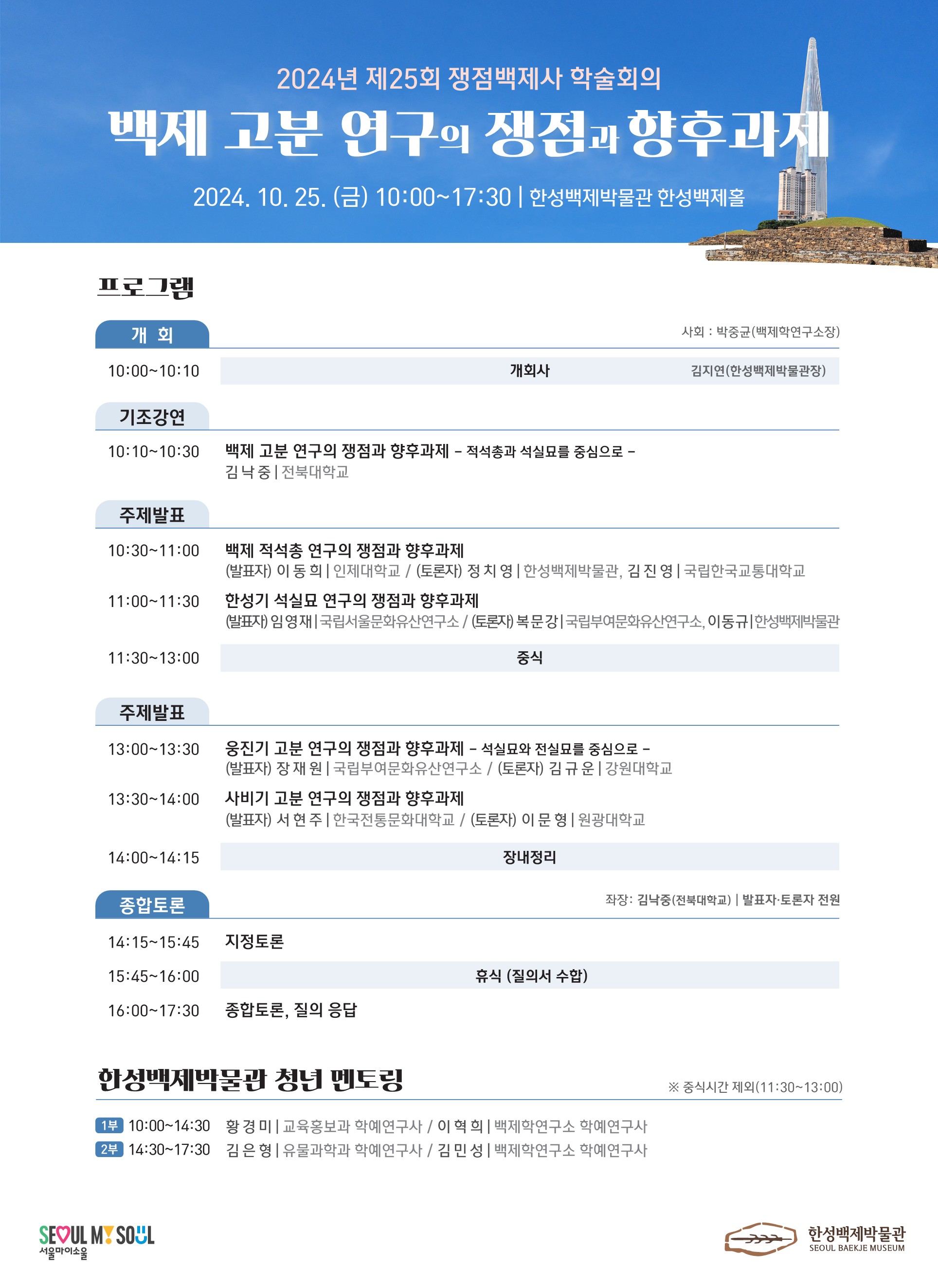 한성백제박물관 백제학연구소는 백제 고고·역사의 중요 현안과 쟁점 사안을 주제로 선정하여 집중 토론하는 <쟁점백제사 학술회의>를 매년 두차례 개최하고 있습니다. 이번 ‘제25회 쟁점백제사 학술회의’는 ‘백제 고분 연구의 쟁점과 향후 과제’라는 주제로 개최합니다.